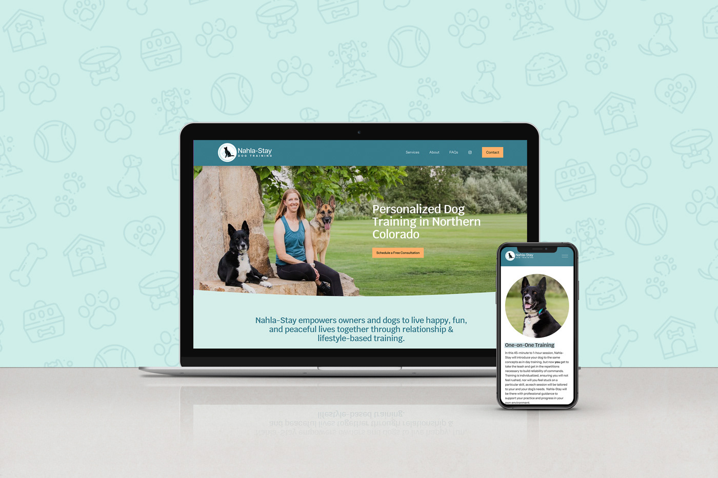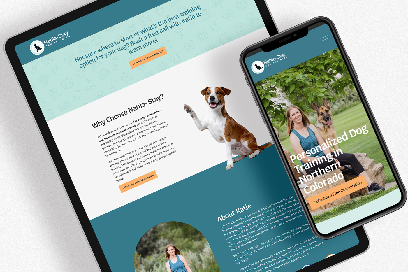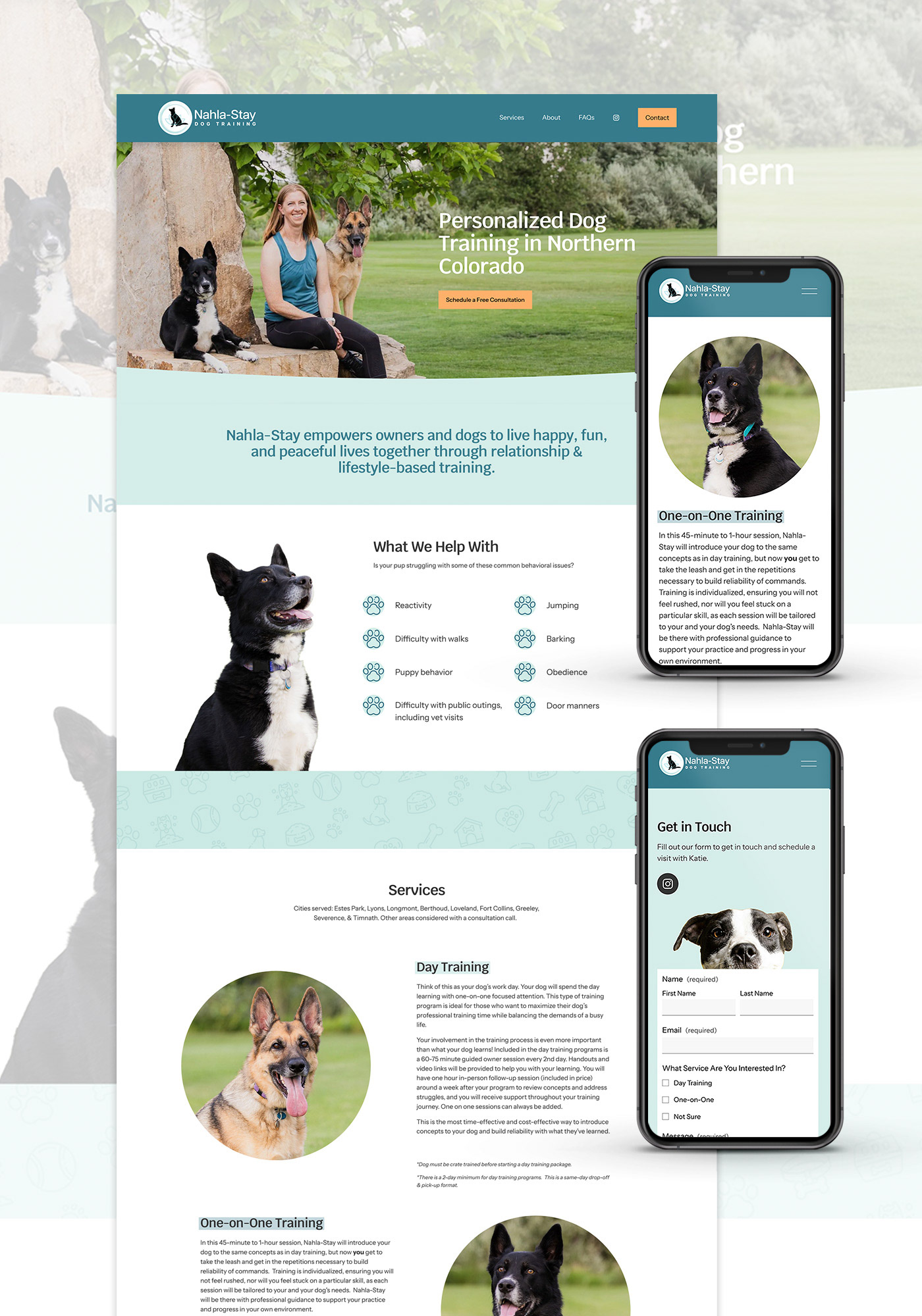 I've wanted to work with a pet-based business for a long time, so I was excited when Katie Henneman from Nahla Stay Dog Training reached out about a website. Nahla Stay is a dog training business in Northern Colorado, (the unique name is inspired by one of Katie's dogs). Nahla Stay already had a logo, but no other brand assets. Using the logo as a starting point, I created a bright and friendly one-page Squarespace site that highlights the business and services. The site was built with flexibility in mind: we'll be able to easily add pages and content as Nahla Stay grows.