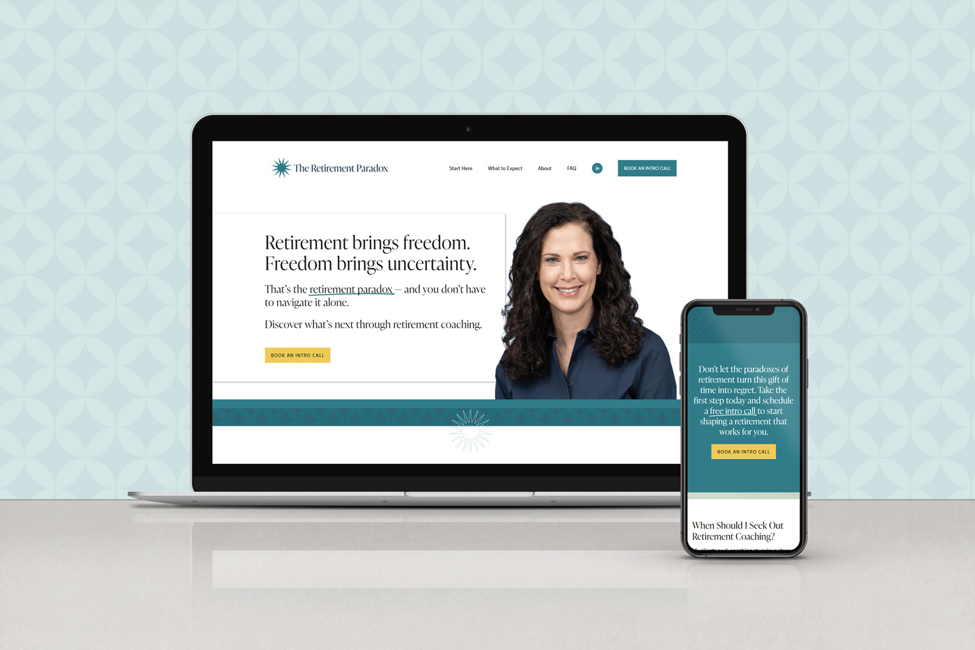Website design for The Retirement Paradox coaching services in Colorado. Sherri Shapiro, owner and retirement coach, wanted a site that was bright, professional, and welcoming for her clients, most of whom are coming from corporate business backgrounds. She didn't have a logo or branding assets when we began, but by starting with a moodboard to establish the visual direction, we came up with a beautiful and cheerful color palette and patterns to make the site look cohesive and reflect Sherri's personality. The one-page website introduces Sherri to potential clients, explains her approach and services, and has a contact form to schedule consult calls. It was designed with flexibility in mind—as Sherri's coaching service grows, we will be able to add more pages and content.